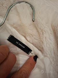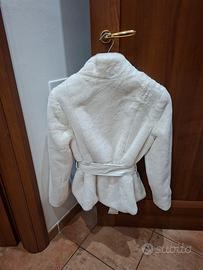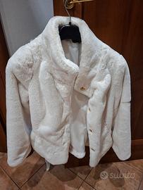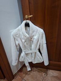 Pellicciotto ecologico usato pochissimo,praticamente nuovo..Cintura in similpelle.Color avorio.Lavabile in lavatrice. Si asciuga tranquillamente in asciugatrice.