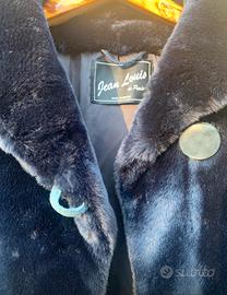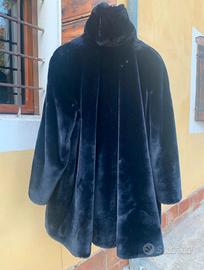 Pelliccia blu notte ecologica, elegante, collo ampio e morbido, fodera interna liscia con comode tasche laterali
