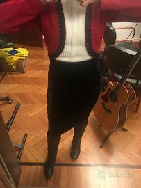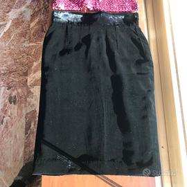 Gonna a tubino di viscosa e seta, foderata, made in Italy, taglia 42 Il taglio a matita e la vita alta la rendono un classico "rinfrescato", il colore nero e la composizione di alta qualità la rendono adatta anche ad occasioni serali "importanti"
