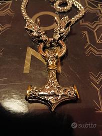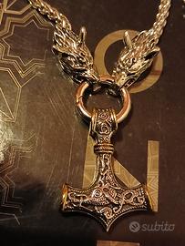 Pendente Acciaio massiccio con Pendente raffigurante Martello vichingo 4½x3½ più anello con 2 teste di Lupo a sorreggere l'anello d'acciaio.Catena in metallo robusto da 60cm.