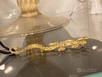 Pendente scultura realizzato a mano, in Italia, con la tecnica a cera persa, in bronzo giallo. Il pendente raffigura una simpatica salamandra portafortuna, dalla coda lunga. Ha un anellino per essere appeso a fettuccia pelle o tessuto. E’ un pezzo unico, realizzato ogni volta da zero. Una scultura in bronzo, non pesante, dato che è scavata nella parte posteriore. E’ un pendente nuovo, portafortuna, come lo è la salamandra. Articolo nuovo, con etichetta.