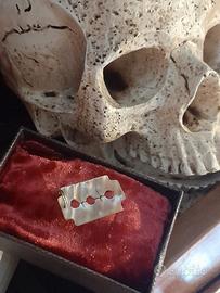 La lametta riproduce le fattezze originali delle lamette di un tempo, è stata intagliata a mano nella madreperla, ha dei riflessi oplaescenti naturali.