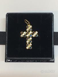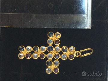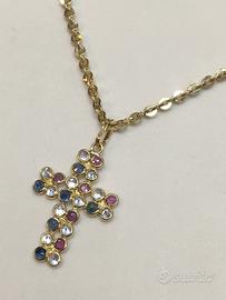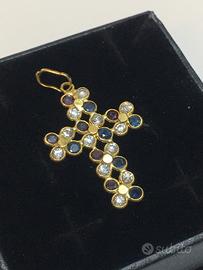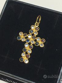 Proponiamo questo splendido pendente a croce in oro giallo 750 con pietre. Collana esclusa.