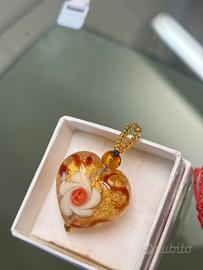 Pendente artigianale vintage in vetro di Murano, realizzato da Antica Murrina Venezia (collezione Voltolina), forma a cuore con decori in polvere d’oro e rossa con dettaglio floreale centrale in vetro bianco e rosso, cordino in perline