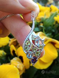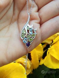 Pendente in argento massiccio 925 rodiato con peridoti naturali del Pakistan, topazi azzurri ed ametista naturali del Brasile. Lunghezza pendente 34 mm. Catena non inclusa.