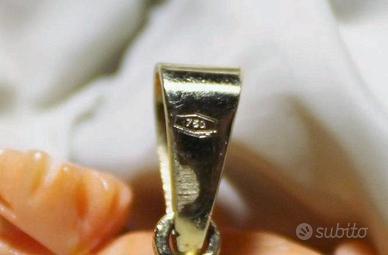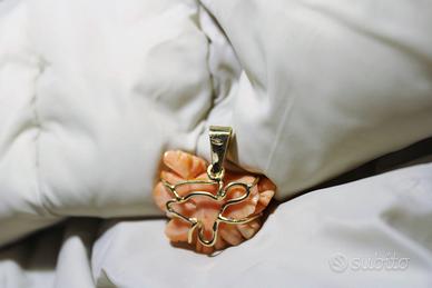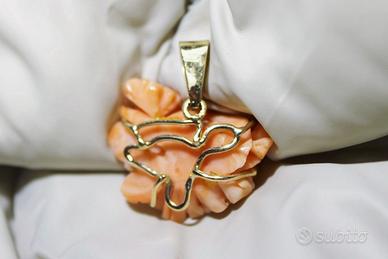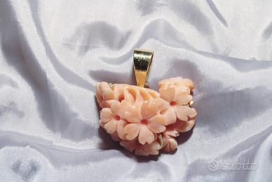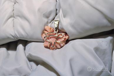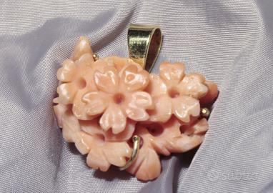 Grazioso pendente in originale corallo rosa Italiano a motivo floreale.