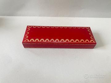 Custodia originale in pelle rossa con piccolo buco nel retro e segni di inchiostro nel vano penna. Corpo della penna in acciaio satinato e rifiniture placcate in oro giallo.