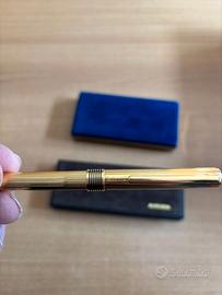 Magnifica penna stilografica vintage Aurora in metallo gold plated con elegante cesello lineare. Custodia originale in buono stato tranne per alcune crepe interne nel solco di appoggio della penna. In condizioni perfette, mai utilizzata e corredata da cartuccia di inchiostro originale sigillata. Dimensioni: diametro 0,7 cm, lunghezza 13,5 cm
