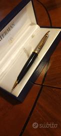 Waterman Carène Deluxe Penna a Sfera, Punta Media con Cartuccia di Inchiostro Blu, Nero Lucido con Clip Dorata 23 Carati e Placcata in Argento, Confezione Regalo