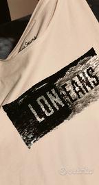 È di cotone e viscosa bianca con scritta Londra di paillettes 'magiche', passando la mano cambia la scritta e il colore da nero ad argento creando degli effetti molto carini.