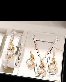Il set è composto da tre pezzi: 1 paio di orecchini, 1 braccialetto e 1 collana. Tutti i pezzi hanno un design coordinato, caratterizzato da una combinazione di oro e perle.