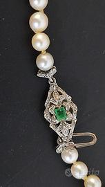 Collana di perle vere d’acqua salata, montate in misura degradé. Chiusura in oro bianco con smeraldo centrale e diamanti laterali, lavorazione di alta qualità.
