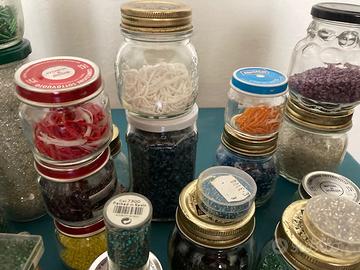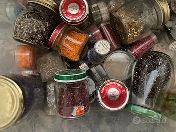 Perline in vetro da ricamo, bigiotteria divise per colore e tipologie in contenitori di vetro, vari colori e varie forme. No spedizione