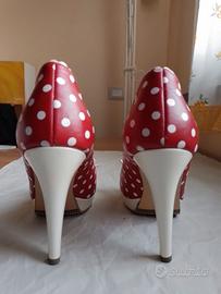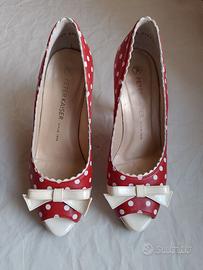PETER KAISER scarpe décolleté spuntate, peep toe n.37,5 in vera pelle rossa con pois, fiocco, bordo smerlato, tacco (cm 11) e plateau (cm 2) color panna, stile pin up, retro, anni '50, Minnie Mouse, davvero deliziose, femminili e civettuole; tomaia, fodera e sottopiede in vera pelle, suola in gomma e altri materiali.