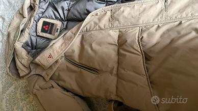 Originale, usato pochissimo, piumino al ginocchio, tessuto tecnico, tinta beige, cappuccio staccabile, maniche lunghe, interno in piuma d'anatra, imbottitura pesante, chiusura con zip e bottoni, tasche a fessura, lavabile in lavatrice, e asciugatrice tg44