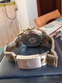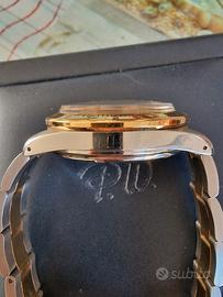 Vendo orologio perfettamente funzionante con movimento automatico calibro eta 2892 con modulo dubois depraz. La cassa in acc/oro (placcata) misura 40mm esclusa corona logata a vite, quadrante azzurro chiaro con indici e lancette a bastone luminescenti, vetro plexi, prodotto negli anni 80/90. Pulsanti a pompa. Bracciale originale logato con maglie centrali placcate in oro. Pari al nuovo, completo di scatola e documenti.