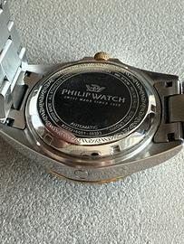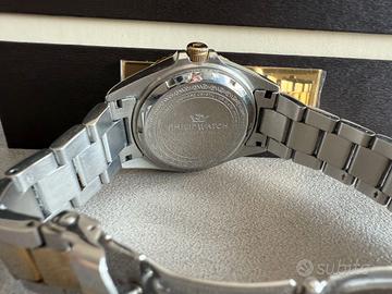 Orologio da uomo Philip Watchdella collezione Caribe. Il movimento dell'orologio è meccanico a carica automatica Swiss Made con funzione datario. La cassa dell'orologio èrealizzata in acciaio, diametro 42 mm. Il bracciale è realizzato in acciaio bicolore argento e oro. Il quadrante è di colore blu. La resistenza all'acqua è di 30 atm / 300 metri. Referenza:R8223216010