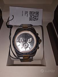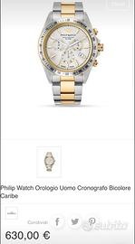 Philip Watch Bicolore Caribe Mod. Dayton: 42mm un orologio elegante e sofisticato, ispirato al design iconico della Rolex Daytona. La combinazione di colori bicolore, probabilmente in oro e acciaio, gli conferisce un aspetto lussuoso e raffinato. Un oggetto di desiderio per gli appassionati di orologi di alta gamma. collezione Caribe, Movimento al quarzo cronografo Swiss Made, Cassa e bracciale in acciaio bicolore, Quadrante argento, W.R. 100m.