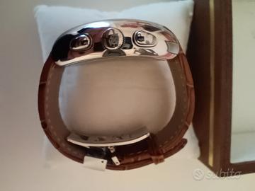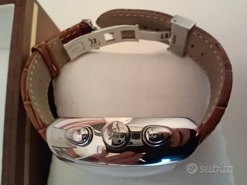 Philip Watch Panama, cronografo a tre contatori dalla sofisticata cassa tonneau in acciaio e cinturino in pelle con fibbia a farfalla. Sul quadrante bianco, numeri arabi, sfere a foglia scheletrate, datario a finestrella a ore 3. Vetro minerale. Movimento meccanico a carica automatica. Impermeabile fino a 5 Nuovo mai indossato, corredato di scatola che presenta qualche segno. Su richiesta posso inviare altre foto. Scambio a mano