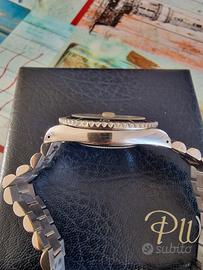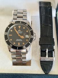 Vendo orologio perfettamente funzionante con movimento automatico calibro eta 2824 con 28.800 ah, cassa misura 39mm esclusa corona logata a vite, quadrante nero, indici a bottone applicati, lancette mercedes, il trizio ingiallito non è più luminescente. Orologio diver raro, impermeabilità non testata, bracciale in acciaio generico + cinturino in pelle con fibbia originale logata. Completo di scatola ma senza documenti.
