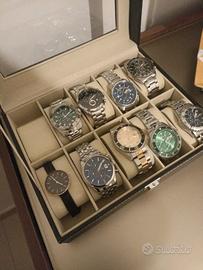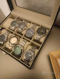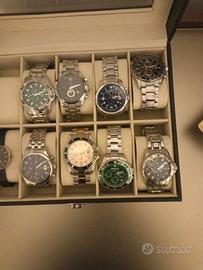 Vendo splendida collezione di 9 orologi, un mix di marchi e stili ideale per ogni occasione! Tutti gli orologi sono perfettamente funzionanti, dotati di batterie nuove e tenuti in ottime condizioni. Perfetti sia per un uso quotidiano che come pezzi da collezione. Ecco i modelli inclusi nel lotto: Casio Edifice: Un classico intramontabile, elegante e funzionale. Sector (blu): blackeagle un modello versatile e resistente. Philip Watch Blaze Cronografo: Un pezzo di alta qualità con cassa grande (>4cm) in acciaio, cinturino lungo (>20cm) e vetro minerale trattato zaffiro. Festina Multifunction F20445/2 (verde): Un orologio multifunzione dal design moderno con quadrante verde, cassa grande (>4cm) in acciaio e cinturino lungo (>20cm). Festina (blu): un orologio affidabile e dallo stile sportivo. Festina Multifunzione (F16242) cronografo Sector 230 Cronografo (verde): Un robusto cronografo con quadrante verde, cassa grande (>4cm) in acciaio e cinturino lungo (>19cm). Invicta: Un marchio noto per i suoi orologi subacquei di alta qualità. Invicta pro driver linea "Shark" Festina (blu): un altro orologio festina affidabile e dallo stile piu elegante: In vendita: Orologio Festina Cronografo al Quarzo numero di serie F20374 Liu Jo: Un orologio elegante e alla moda, perfetto per un look contemporaneo. da donna in regalo scatola contenitore Condizioni: Tutti gli orologi sono in ottime condizioni estetiche e funzionali. Le batterie sono appena state sostituite. Si prega di notare che non sono incluse scatole o maglie aggiuntive. Ulteriori Informazioni: Scambio: Valuto scambi con altri orologi o articoli di mio interesse. Dettagli specifici: Se siete interessati a un modello in particolare, non esitate a chiedere ulteriori dettagli o foto aggiuntive. Garanzia: Non si offre garanzia residua, ma si assicura il perfetto funzionamento al momento della vendita.