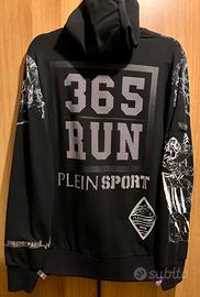 Philipp Plein/Plein Sport originale, felpa nera con cappuccio e zip, cotone elasticizzato, stampa leone, dietro numeri e scritta in strass.