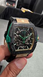 Orologio automatico che mette in mostra un quadrante scheletrato e un movimento meccanico. È progettato come un audace orologio da polso per tutti i giorni con elementi in carbonio e accenti a contrasto verdi. Caratteristiche principali: Nero | Verde | Acciaio inossidabile | Resistente all'acqua fino a 50 m (5 ATM) | Movimento automatico (calibro Seiko NH70) | Cinturino in silicone | Chiusura con fibbia ad ardiglione | Quadrante scheletrato | Cassa a forma di tonneau | Elementi in carbonio | Accenti a contrasto verdi | Opzione bicolore possibile | Dimensioni e vestibilità: Diametro cassa: ca. 44 mm (forma tonneau) | Spessore cassa: ca. 14 mm | Composizione e cura: Acciaio inossidabile (cassa) | Elementi in carbonio | Silicone (cinturino) | Vetro minerale.