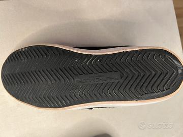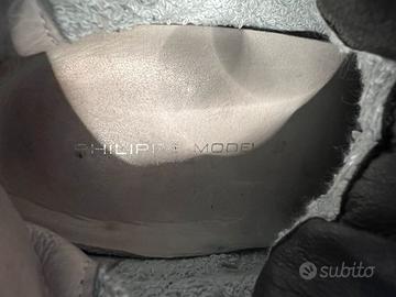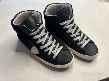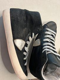 Vendo originali Philippe Model mod. PRSX High , numero 37, donna , nere effetto scamosciato con dettagli in pelle liscia. Non ho piu la scatola , causa trasloco. Come si può vedere , usate 3/4 volte , suola intatta non ingiallita, senza usura , anche la scritta sia sotto la suola che all’interno della scarpa intera non consumata .