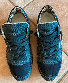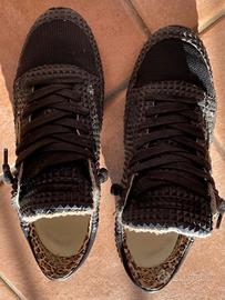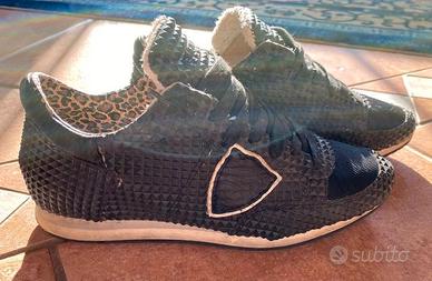 Scarpe Philippe Model modello Tropez X (o simile) in pelle e tessuto tecnico di colore blu nero con un distintivo motivo a borchie tridimensionali/piramidi su tutta la tomaia. Presentano l'iconico scudo laterale in pelle chiara e un vivace dettaglio in fantasia leopardata sul tallone interno, che aggiunge un tocco audace. Le condizioni sono usate ma ancora ottime (come da foto)