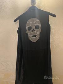 Look rock-chic con zip frontale e dettagli in metallo. Sul retro il celebre teschio in strass brillanti, luminoso e ben fissato. Tessuto morbido e confortevole. Ottime condizioni, senza difetti. Ideale per outfit unici o occasioni speciali.