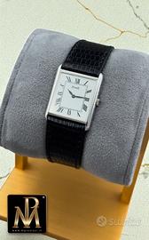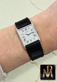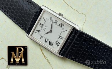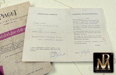 Piaget ref. 9287 garanzia dell’epoca – oro bianco 18 carati Elegante Piaget vintage anni ’70 in oro bianco 18 carati, con classica cassa rettangolare ultra-sottile, espressione tipica dello stile raffinato della maison. Cassa dalle proporzioni armoniose, misura circa 28 x 23 mm, con spessore estremamente contenuto che garantisce grande comfort al polso. All’interno monta il calibro Piaget 9P, movimento meccanico a carica manuale ultra-piatto (circa 2 mm), tra i più iconici della casa. Quadrante ristampato L’orologio è completato da fibbia ad ardiglione originale Piaget in oro bianco 18 carati e da cinturino nuovo realizzato artigianalmente. Corredato dalla garanzia originale Piaget datata 7 novembre 1975, (concessionario Gobbi) elemento raro e di forte interesse collezionistico e dalla sua pochette dell’epoca.