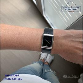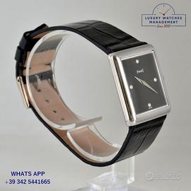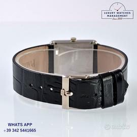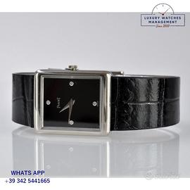 Piaget Tank ultra piatto oro bianco 18KT, anno di produzione circa 1979, vetro piatto minerale, quadrante colore nero con indici diamante e sfere originali Piaget dell’epoca, movimento meccanico a carica manuale, cinturino in pelle di coccodrillo lucido colore nero con fibbia oro bianco 18KT originale Piaget.