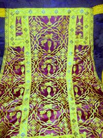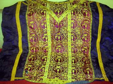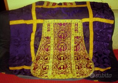 Tessuto viola damascato arricchito con stoffa rossa porpora ricamata con fili dorati con simbologia del periodo pasquale. La stola ha un segno di usura e l'abito presenta dietro in basso, una piccola mancanza (vedi ultima foto). (594)