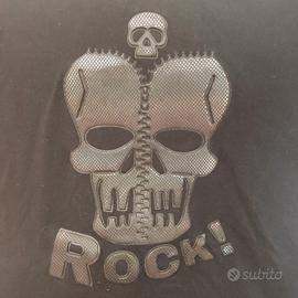 Maglietta T-shirt a maniche corte da uomo nera con stampa frontale a forma di teschio e scritta Rock colore nero multicolor taglia XL - Stampa con teschio e scritta Rock! - Dettagli colorati e glitterati! Misure: -Larghezza torace 60 cm -Lunghezza totale 70 cm Per altre info contattatemi! Spedizione rapida! NO CORRIERE INPOST