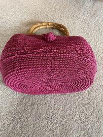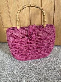 In vendita una piccola borsa intrecciata rosa con manici in bambù.
