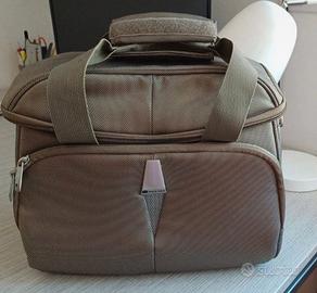 Misura 33x25x 20 cm circa. Adatto come bagaglio a mano, piccola borsa da viaggio, valigia piccola, beatycase o zainetto anche per viaggi brevi o per accessori viaggio. Piccola per modo di dire, molto comoda e capiente: Ben 4 zip per 4 tasche: una che consente di inserire tutto all'interno (dove sono presenti altri scomparti laterali,molto capiente perché aperto su sé stesso), una cerniera in basso su davanti tondeggiante che apre uno scomparto sufficientemente capiente su tutta la lunghezza. Altre due cerniere sul retro consentono di inserire oggetti più personali ( come si vede in foto). Nuovissimo mai usato. Loggato,originale come da foto. Colore neutro perfetto, unisex. I manici superiori sono imbottiti. Il tutto possiede una comoda tracolla, anche essa presente e da inserire ai lati. Adatto anche in aereo. Ogni scomparto aperto con le zip risulta IMBOTTITO per protezione contro urti.