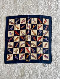 Piccolo foulard in seta Ferragamo 100% seta, stampa con calzature colorate e fondo a scacchi blu e bianco. Vintage anni ’90 – primi duemila.
