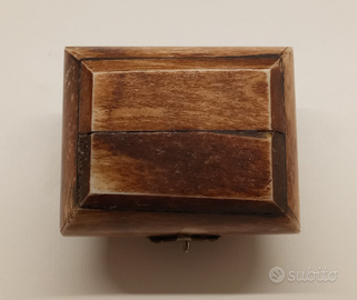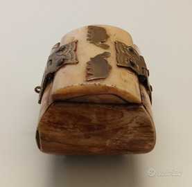 Piccolo portagioie in osso fatto a mano, decorato con applicazione di tartarughe e gufi. Rivestito internamente. Dim. 5 x 4 x h. 3,5 cm
