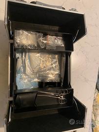 Attrezzatura per piercing e gioielli di varie tipologie e valigetta.