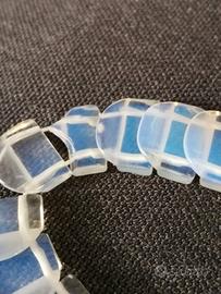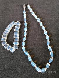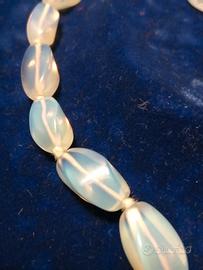 La collana misura cm. 52,ogni elemento è lungo cm. 2 il braccialetto è formato da 19 elementi di cui uno purtroppo danneggiato che vanno reinfilati perché gli elastici sono da sostituire. Da notarela bella luce opalescente bianco azzurrina tipica di queste pietre.