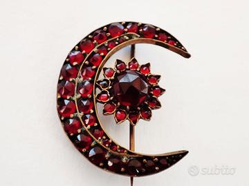 4 foto: Spilla antica *Mezzaluna*, granati di Boemia, tombak, prima del 1940, condizioni perfette, ma manca una pietra, compresa nel prezzo. Europa. Raro, perché dentro non c'è una stella, ma un fiore. La serratura funziona. Prezzo 360 еuro;