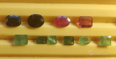 Lotto di pietre preziose di colore naturali miste, composto da: 5 zaffiri ovali 11 smeraldi ottagonali 1 rubino ovale 1 rubellite rosa ovale 1 tormalina rosa 1 zaffiro a goccia 1 smeraldo ovale Totale 21 pietre. Peso complessivo ct. 26,50 c.a. Pietre originali.
