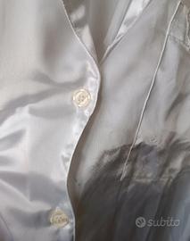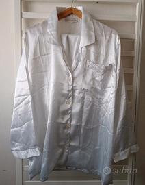 Pigiama spezzato con ricamo su taschino , vintage in raso bianco. Confezioni di lusso. Taglia 48. Maglia con bottoni e pantaloni con elastico in vita. Ottime condizioni. Segnalo piccola imperfezione sulla camicia che non si nota se i bottoni sono allacciati.
