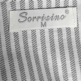 Pigiama da uomo estivo con righine bianche e grigie. 95 % cotone. 5% polyester. Tessuto morbido e leggero. Taglia M. Marca Sorrisino. Giacca a manica corta con collo a bavero e chiusura con bottoni classici e un taschino. Pantalone lungo con elastico in vita. Dettagli con piping grigio scuro a contrasto all'altezza delle maniche, del collo e del taschino
