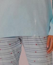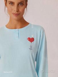 Un pigiama dallo stile romantico e raffinato, ideale per chi ama la semplicità con un tocco di tenerezza. Realizzato in tessuto morbido e confortevole, questo set è perfetto per assicurare sogni sereni e un relax assoluto in casa. Viene presentato nella sua confezione originale in busta, rendendolo perfetto anche come idea regalo. Caratteristiche della Maglia Colore: Un delicato azzurro pastello (celeste), rilassante e luminoso. Modello: Maglia a maniche lunghe con collo a serafino e chiusura a piccoli bottoni, che aggiunge un dettaglio classico e funzionale. Dettagli: Sul lato sinistro è presente una deliziosa stampa di un palloncino rosso a forma di cuore con la scritta "Love" in corsivo che funge da filo. Un dettaglio chic che spezza l'uniformità del colore. Vestibilità: Taglio regolare con polsini elasticizzati per mantenere il calore. Caratteristiche del Pantalone Fantasia: Il pantalone richiama la base azzurra della maglia ma è arricchito da una trama a righe orizzontali sottili blu navy. Dettagli: Piccoli cuoricini rossi sono sparsi su tutto il pantalone, richiamando perfettamente il motivo grafico della maglia. Comfort: Vita elasticizzata per una vestibilità comoda che non stringe durante il sonno. Ultime Disponibilità1 pezzo S e 1 pezzo M Ultimi pezzi: Questo modello è tra i più amati per il suo design pulito e la dolcezza dei suoi dettagli. Essendo rimasti solo un pezzo per la taglia S e uno per la taglia M, è l'occasione ideale per accaparrarsi un capo di qualità a un ottimo prezzo. prezzo per singolo pigiama .