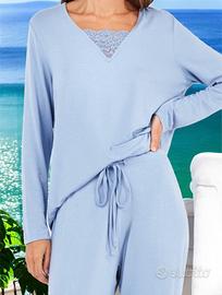 Pigiama Donna in Viscosa con Dettagli in Pizzo Elegante e confortevole, questo pigiama da donna è realizzato in morbida viscosa, un tessuto leggero e traspirante che garantisce una piacevole sensazione sulla pelle durante tutta la notte. La maglia a manica lunga presenta un raffinato scollo a V impreziosito da delicato pizzo, che dona un tocco femminile e romantico. Sul retro, un ulteriore inserto in pizzo aggiunge un dettaglio elegante e ricercato. Il pantalone lungo ha una vestibilità comoda e fluida, perfetta per assicurare libertà di movimento e massimo comfort sia per dormire che per i momenti di relax in casa. Taglie disponibili: L e XL Nuovo con etichetta