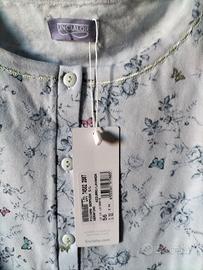 vendo pigiama estivo donna linclalor come in foto composto da canottiera celeste con fiori e farfalle colorate e bottoni sul davanti e pantaloni colore celeste fino al ginocchio a tinta unita. Nuovo con cartellino e scatola originale, taglia 56 , pagato 35 euro