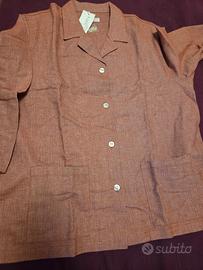 splendido pigiama da donna originale FRETTE, eccellenza italiana nel settore del tessile di lusso. Il capo è nuovo di zecca, mai indossato, ancora piegato come da negozio e completo di etichetta originale. Caratteristiche principali: Materiale: Pregiata flanella di cotone con trama a spina di pesce (spigato), calda e morbidissima. Dettagli: Giacca abbottonata con bottoni loggati Frette e due comode taschine frontali; pantaloni lunghi coordinati. Colore: Rosso ruggine/terracotta molto elegante. Taglia: L (vestibilità comoda). Misure prese in piano: Casacca: Ascella-ascella 58 cm c.a. , Lunghezza totale 67 cm. c.a. Pantaloni: Lunghezza 102 cm c.a. Vita: Elastico alto 3 cm (misura 34 cm a riposo, estendibile fino a 60 cm teso). Incluso il sacchettino con i bottoni di ricambio originali. prezzo retail originale 80€