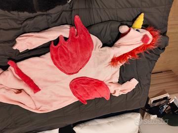 Vendo pigiama / costume da carnevale stile salopette peluche. Cavallo, unicorno con ali e coda. Presenta uno strappo sotto l'ascella ( in foto ). Facilmente ricucibile. Ho anche un pigiama simile leopardato.