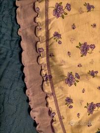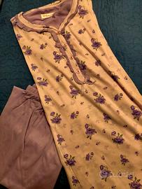 Pantaloni lunghi leggeri in tinta unita lilla, così come la parte inferiore della blusa.